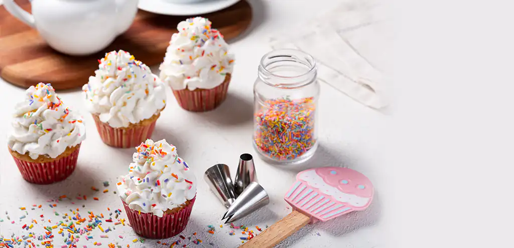 3. Keksiukų glaistą dėkite ant gerai atvėsintų keksiukų, papuoškite apibarstydami spalvotais pabarstukais!